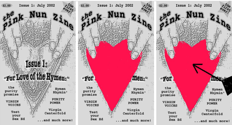 Following is a depiction of the female organ taken from the cover of an online magazine. In the following images the color and arrow are added. I came across this image while researching the article “Another Gospel” back in 2002. The originator of this magazine was a friend of Jay Bakker, son of Jim Bakker. By following a link on the ministry site of Jay Bakker, I was led to this image at a time when I had just begun to consider the origin of the heart symbol. I was immediately struck by the profound resemblance of the female sexual organ with the labia pulled back, and that image we now refer to as a heart symbol.